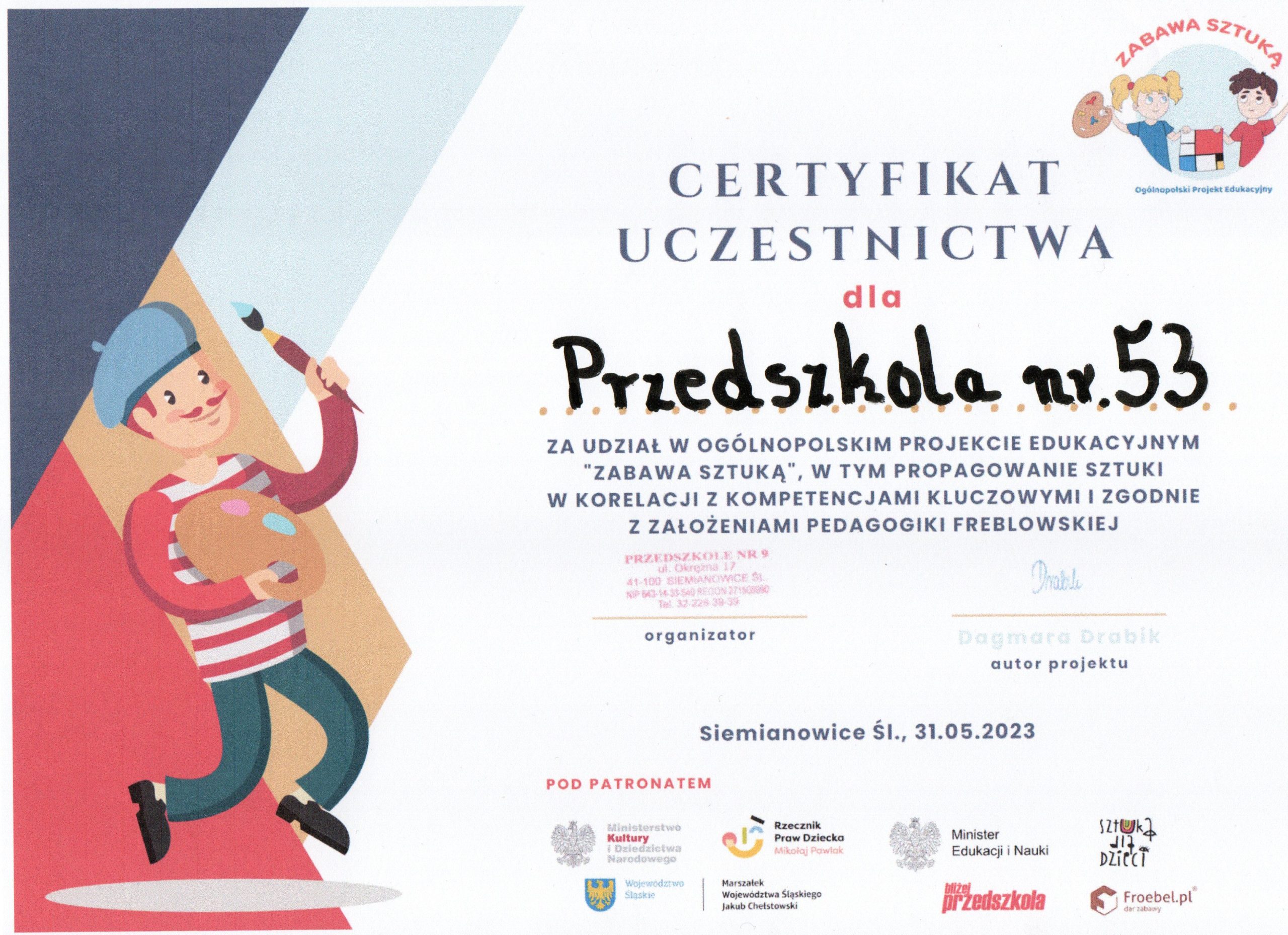 W roku szkolnym 2022 / 2023 Przedszkole nr 53 im. Koszałka Opałka wzięło udział w Ogólnopolskim Projekcie Edukacyjnym pt. „Zabawa Sztuką”. Podczas trwania projektu przedszkolaki zrealizowały szereg ciekawych zadań, w tym: